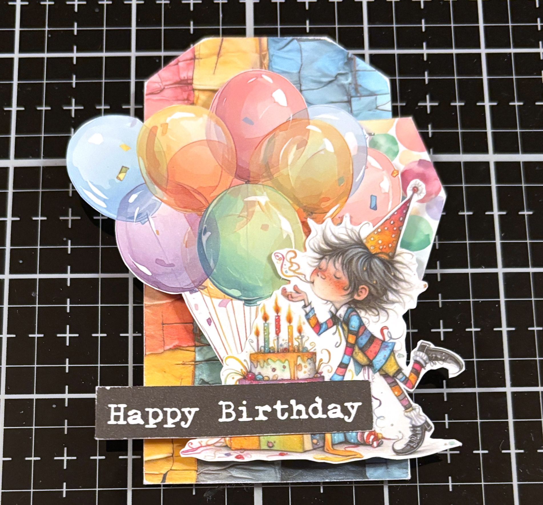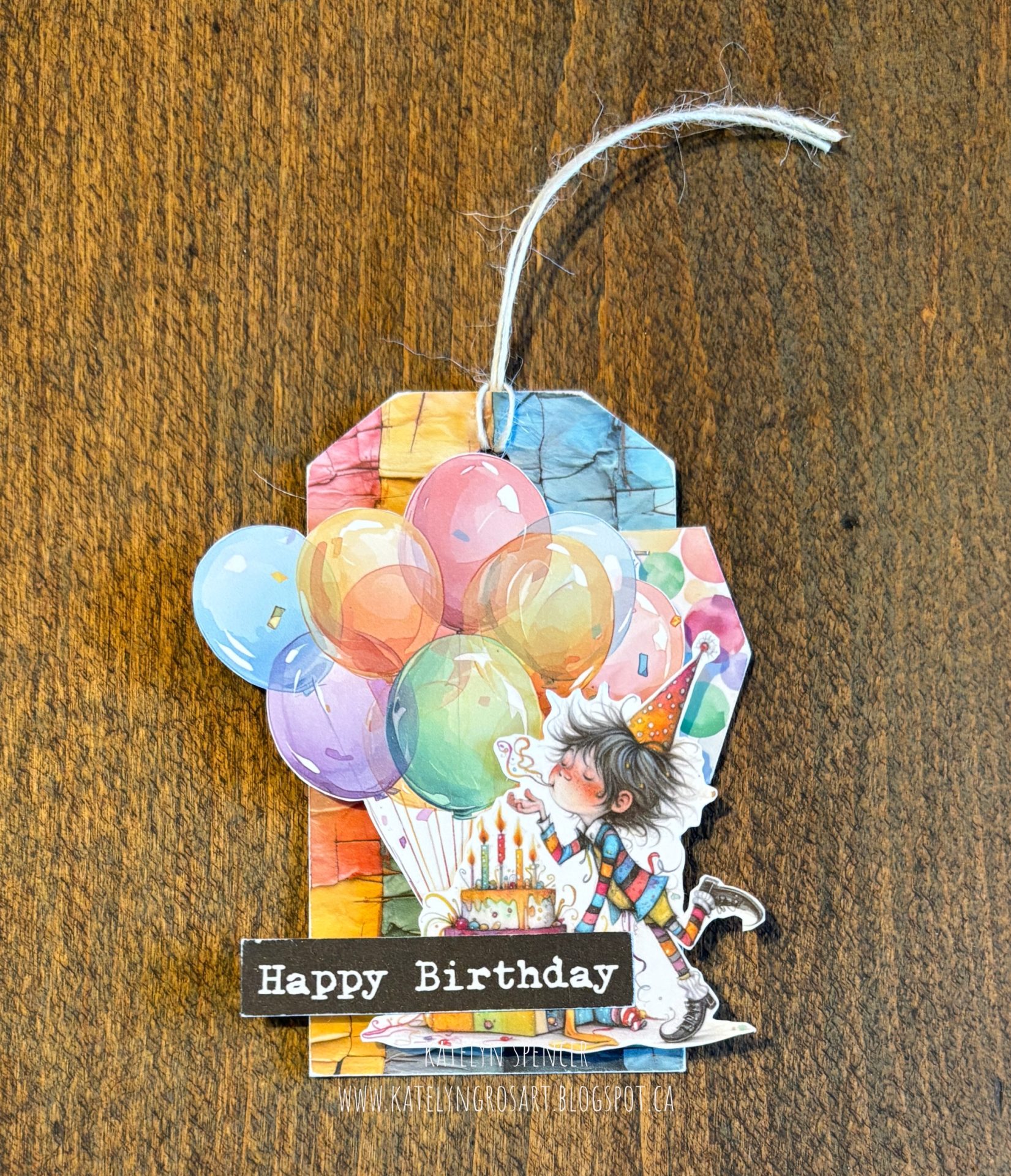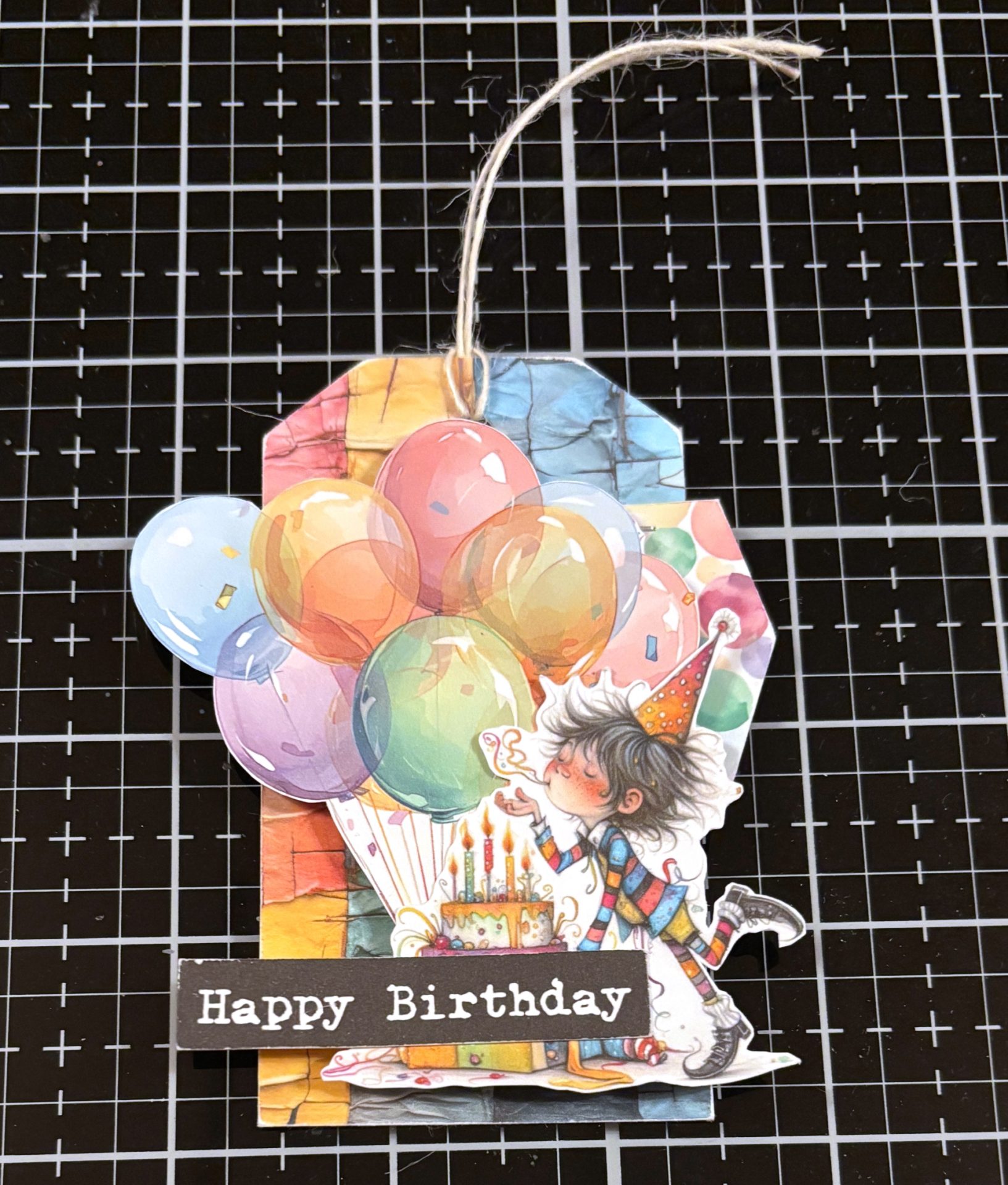 The first tag we’ll create is the Happy Birthday Tag.Closeup detail of birthday gift tags featuring balloons and sentiment.