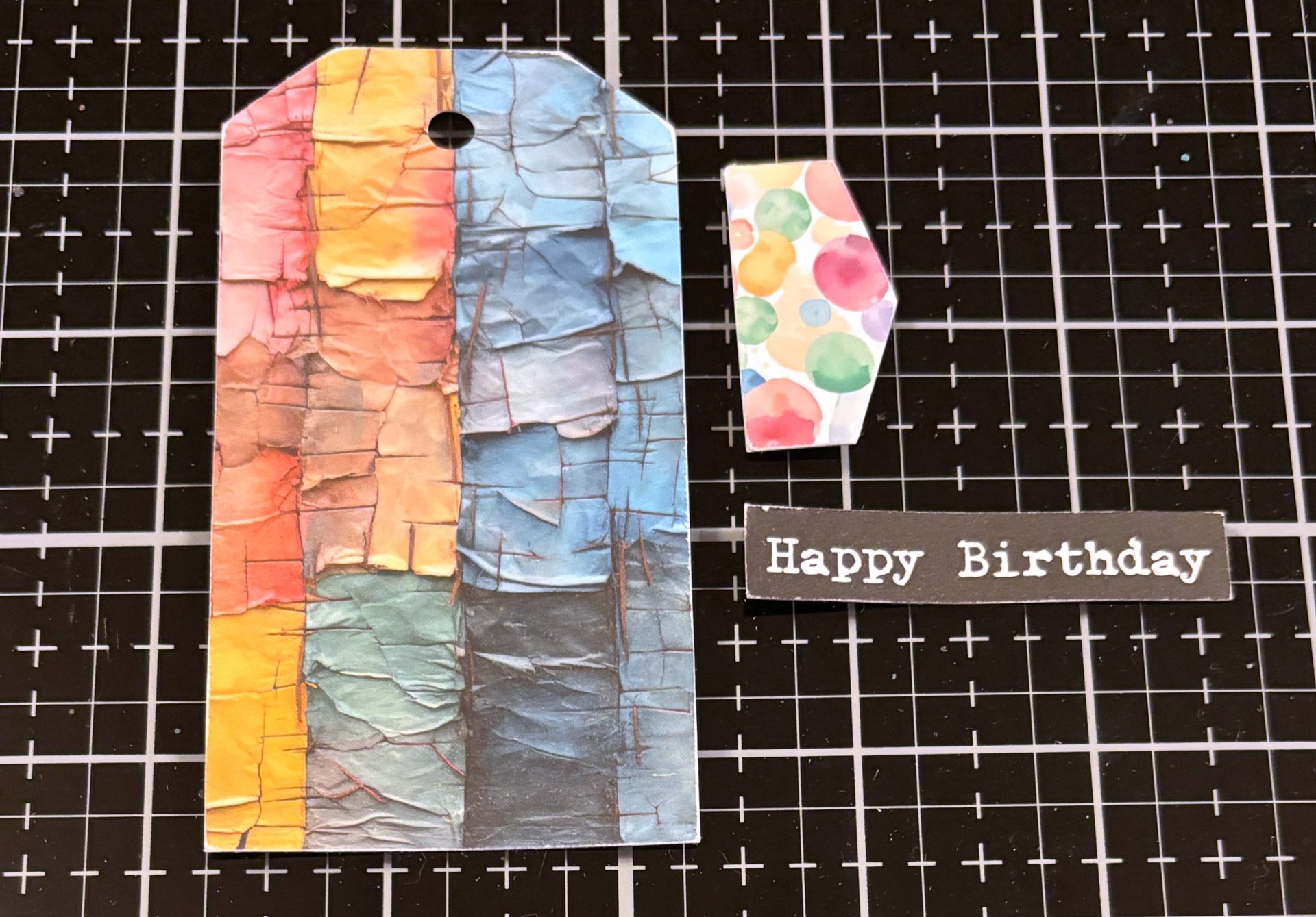 1. Out of the Age Is Just a Number Essentials Ephemera from Simply Stated Design, you’ll need the peeling paint tag, dot banner and happy birthday sentiment. Sand the edges of all three elements. Step 1 of handmade birthday gift tags using Simply Stated Design ephemera.