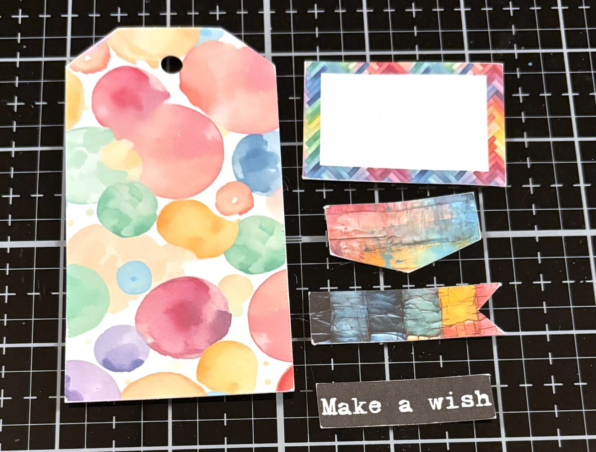 1. Out of the Age Is Just a Number Essentials Ephemera from Simply Stated Design, you’ll need the dot tag, peeled paint skinny banner, larger abstract banner, rectangle with chevrons around the edge and Make a Wish sentiment. Sand the edges of all three elements.