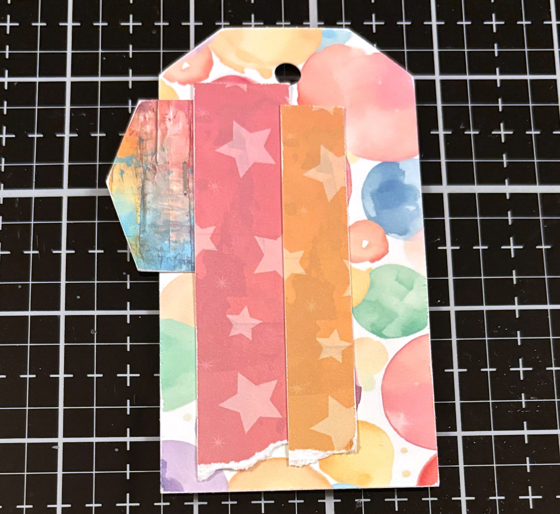 4. Staple the larger abstract banner 5/8” from the top and 1 ¾” from the right of the tag. Use E-Z Runner from Scrapbook Adhesives by 3L to adhere the red paper strip ¼” from the left and ½” from the top of the tag. Adhere the orange paper strip 1” from the left and ¾” from the top of the tag.