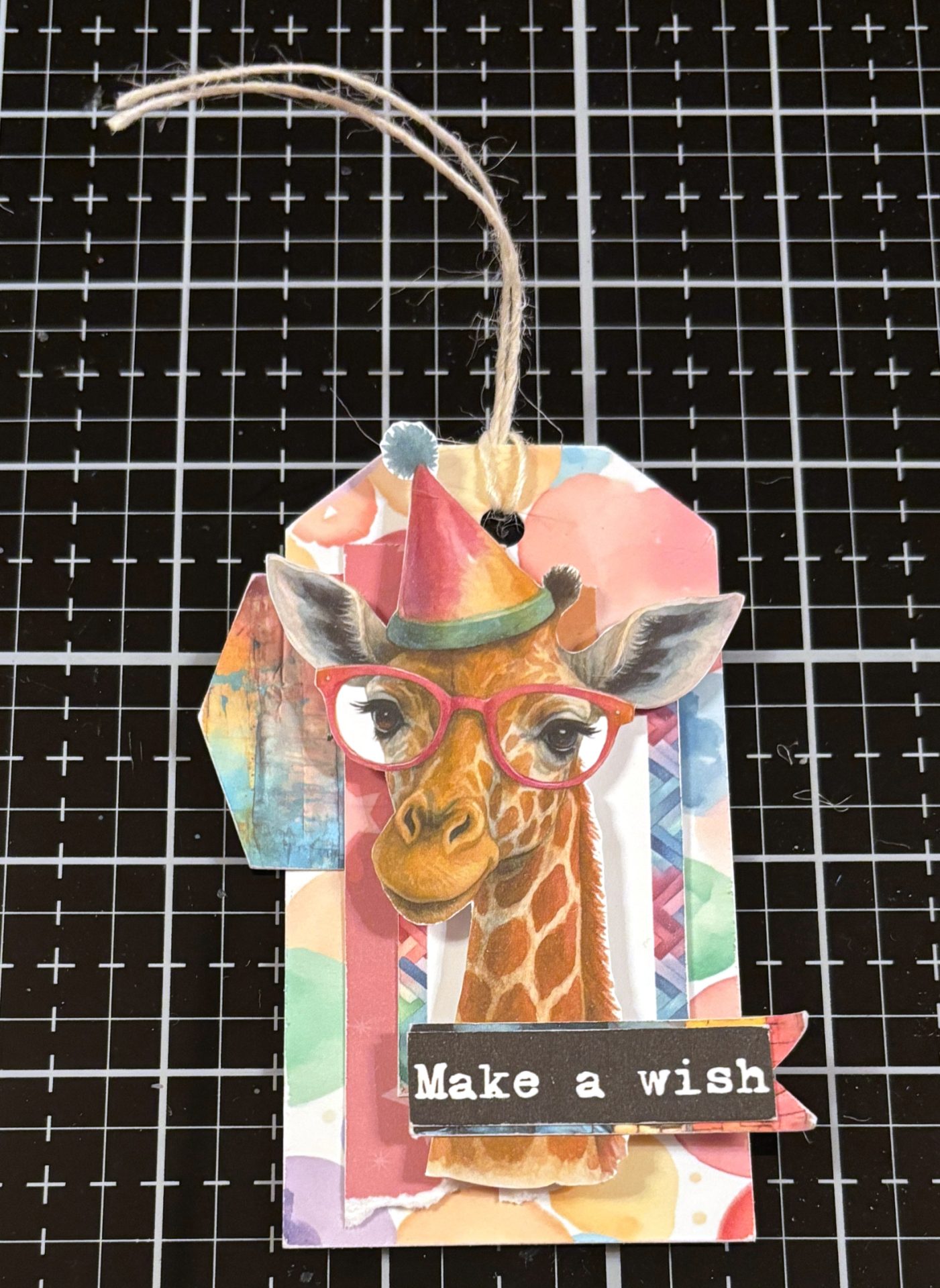 1. Trim the Make a Wish sentiment strip down. Use E-Z Runner from Scrapbook Adhesives by 3L to adhere the Make a Wish sentiment to the peeled paint banner. Use E-Z Runner and 3D Foam Squares from Scrapbook Adhesives by 3L to adhere the banner 3/8” from the bottom and ½” from the left of the tag. To finish the tag, tie a piece of twine through the hole at the top of the tag.